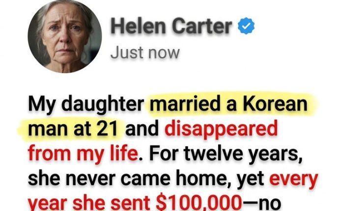 Family Drama StoriesMy Daughter Married a Korean Man at 21, Vanished for Twelve Years, and Sent Me $100,000 Every Year—Then I Found Her at Christmas and Learned the Truth April 23, 2026 - by Reading Times … My Daughter Married a Korean Man at 21, Vanished for Twelve Years, and Sent Me $100,000 Every Year—Then I Found Her at Christmas and Learned the Truth Read More