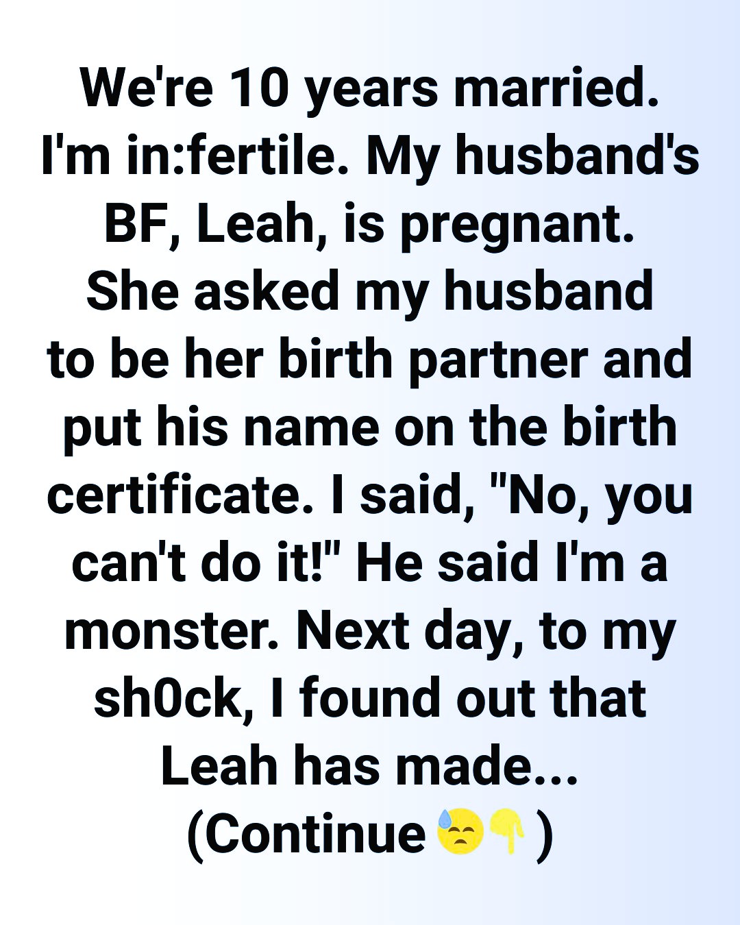 Leah got pregnant after a short relationship with a guy who bailed the moment she told him. Now, weeks from her due date, she asked my husband to be her birth partner. That alone already made me feel weird, but then came the real kicker: she wants him to be on the birth certificate.