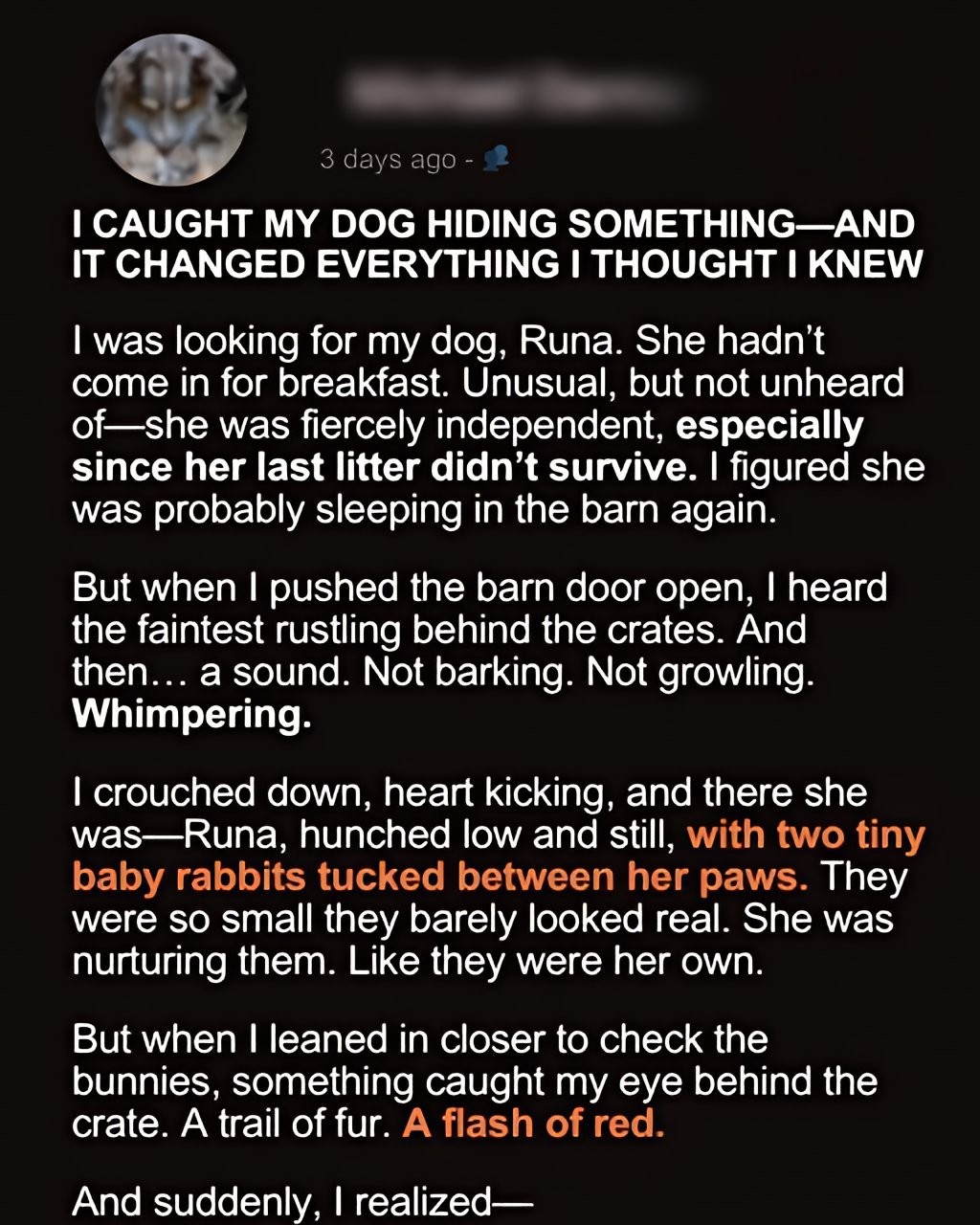 And suddenly, I realized—the red wasn’t just a color. It was the coat of a young vixen, a fox that lay dead and broken just a few feet away in the shadows. Runa hadn’t just found these bunnies; she had fought for them.