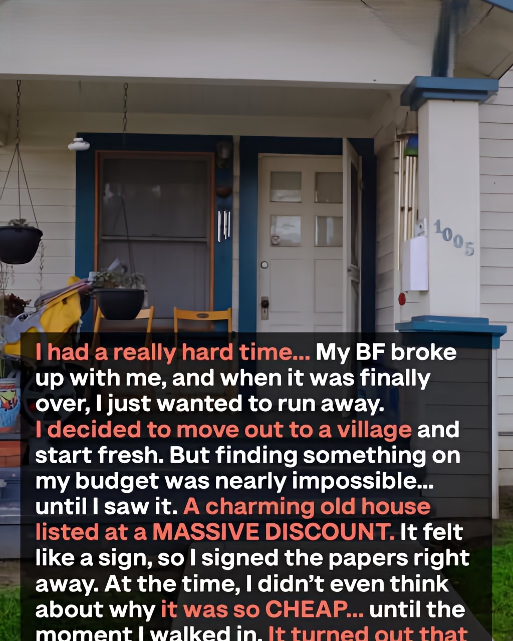 I had a really hard time… My BF broke up with me, and when it was finally over, I just wanted to run away. I decided to move out to a village and start fresh. But finding something on my budget was nearly impossible… until I saw it. A charming old house listed at a MASSIVE DISCOUNT. It felt like a sign, so I signed the papers right away. At the time, I didn’t even think about why it was so CHEAP… until the moment I walked in.