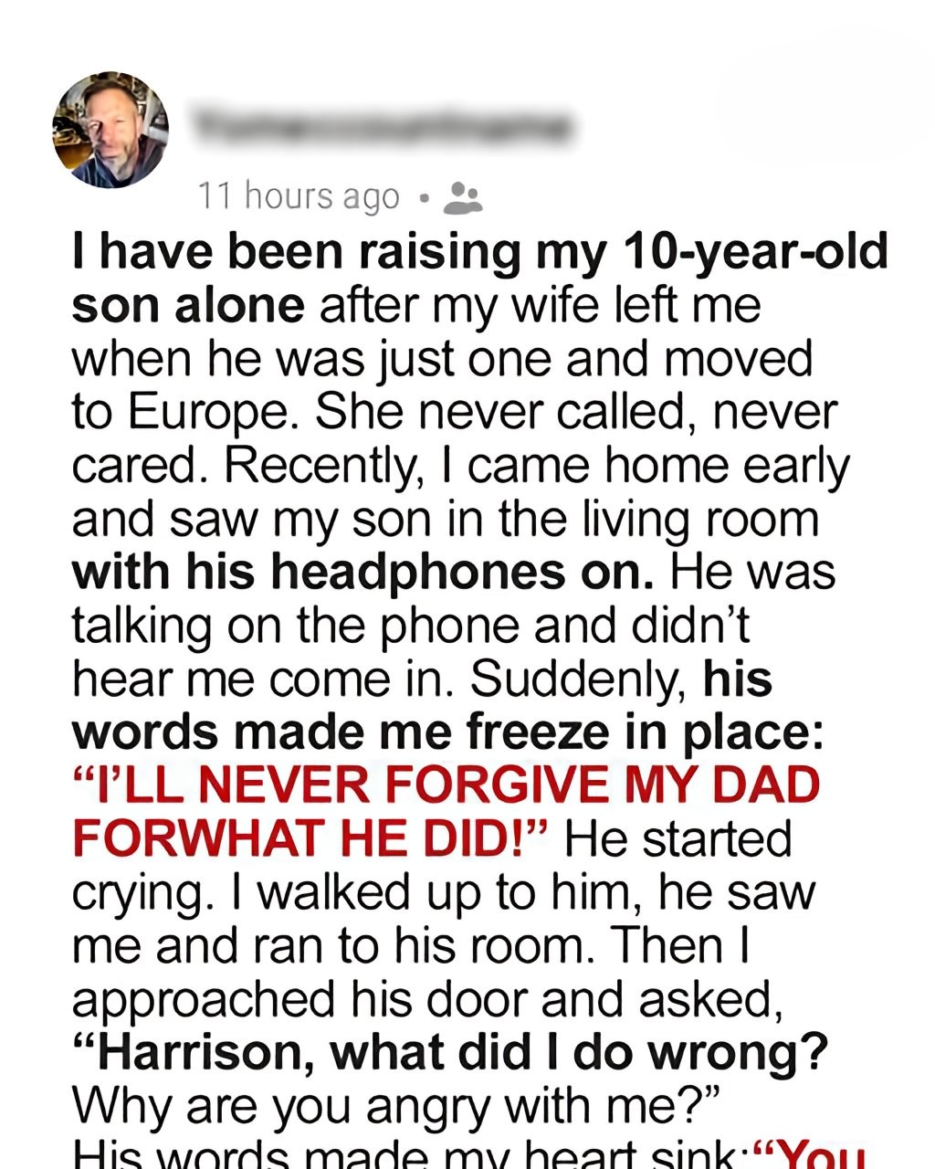 I have been raising my 10-year-old son alone after my wife left me when he was just one and moved to Europe. She never called, never cared. Recently, I came home early and saw my son in the living room with his headphones on. He was talking on the phone and didn’t hear me come in. Suddenly, his words made me freeze in place: “I’LL NEVER FORGIVE MY DAD FOR WHAT HE DID!” He started crying. I walked up to him, he saw me and ran to his room. Then I approached his door and asked, “Harrison, what did I do wrong? Why are you angry with me?” His words made my heart sink: “You lied to me! You told me Mom just left, but she said you kicked her out! She said you threatened her and made her stay away from me all these years!”