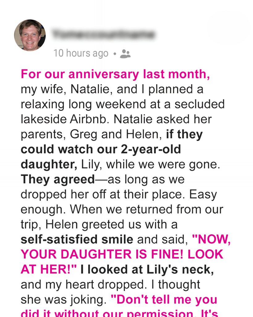 For our anniversary last month, my wife, Natalie, and I planned a relaxing long weekend at a secluded lakeside Airbnb. Natalie asked her parents, Greg and Helen, if they could watch our 2-year-old daughter, Lily, while we were gone. They agreed—as long as we dropped her off at their place. Easy enough. When we returned from our trip, Helen greeted us with a self-satisfied smile and said, “NOW, YOUR DAUGHTER IS FINE! LOOK AT HER!” I looked at Lily’s neck, and my heart dropped. I thought she was joking. “Don’t tell me you did it without our permission. It’s…”