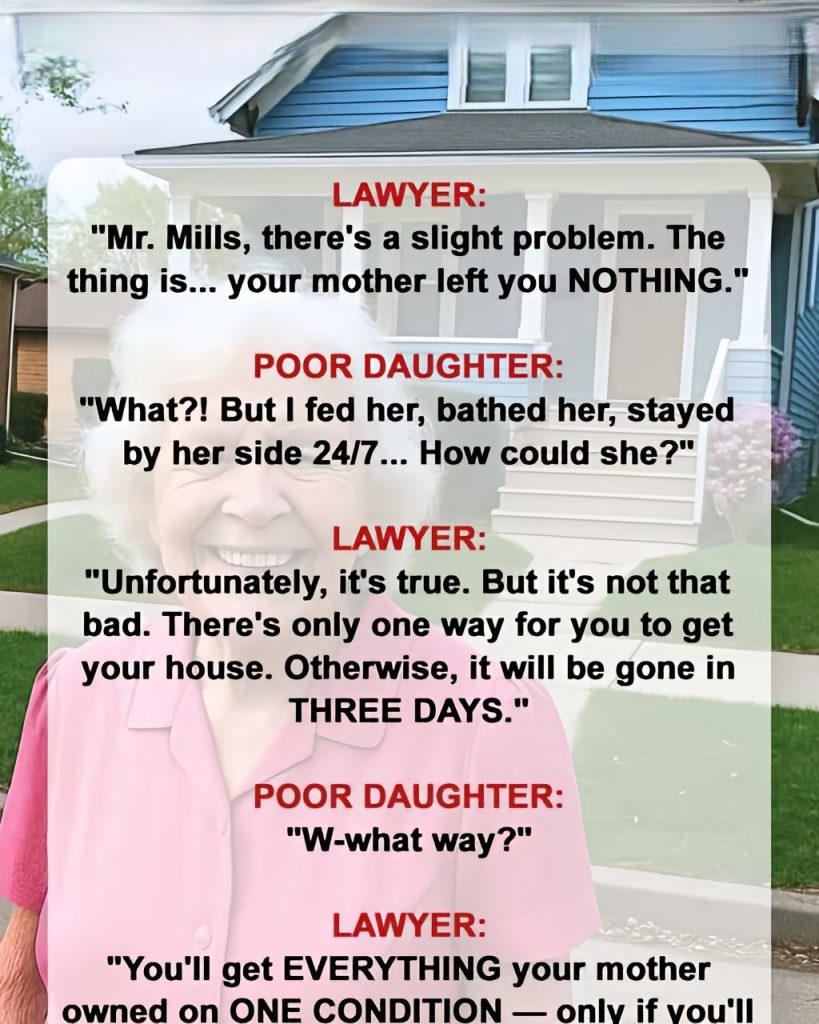 LAWYER: “Mr. Mills, there’s a slight problem. The thing is… your mother left you NOTHING.” POOR DAUGHTER: “What?! But I fed her, bathed her, stayed by her side 24/7… How could she?” LAWYER: “Unfortunately, it’s true. But it’s not that bad. There’s only one way for you to get your house. Otherwise, it will be gone in THREE DAYS.” POOR DAUGHTER: “W-what way?” LAWYER: “You’ll get EVERYTHING your mother owned on ONE CONDITION — only if you’ll spend these next three nights living in that house exactly as she did, following her secret written instructions without asking a single question.”