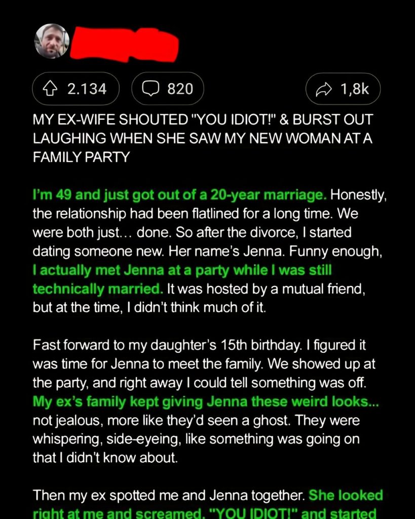 I’m 49 and just got out of a 20-year marriage. Honestly, the relationship had been flatlined for a long time. We were both just… done. So after the divorce, I started dating someone new. Her name’s Jenna. Funny enough, I actually met Jenna at a party while I was still technically married. It was hosted by a mutual friend, but at the time, I didn’t think much of it. Fast forward to my daughter’s 15th birthday. I figured it was time for Jenna to meet the family. We showed up at the party, and right away I could tell something was off. My ex’s family kept giving Jenna these weird looks… not jealous, more like they’d seen a ghost. They were whispering, side-eyeing, like something was going on that I didn’t know about. Then my ex spotted me and Jenna together. She looked right at me and screamed, “YOU IDIOT!” and started laughing hysterically, tears of dark, cynical amusement streaming down her cheeks.