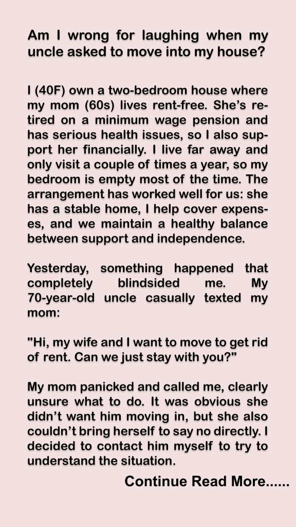 Reddit, AITA for laughing and firmly saying no to my uncle’s request to move into my mom’s house? I want to maintain family ties without compromising my or my mom’s stability.
