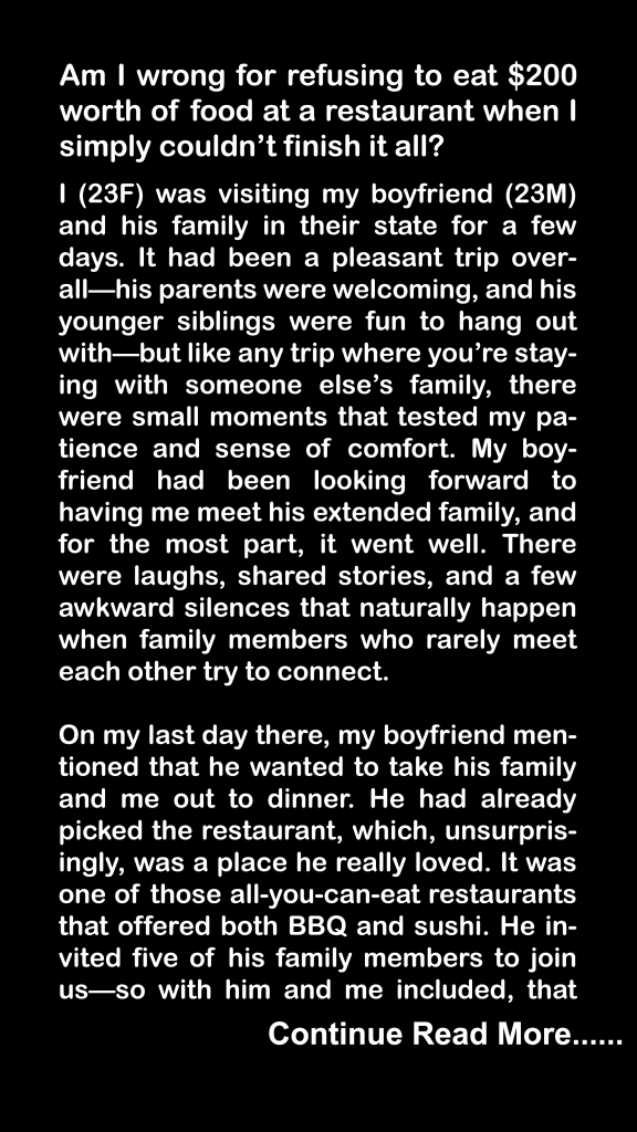 Looking back, I realize this situation highlighted more than just a disagreement over food. It revealed something about our relationship dynamics—how he handles disappointment, how he interprets gestures of politeness, and how he reacts when others don’t conform to his expectations. It wasn’t about the dinner itself; it was about control, expectations, and respect for personal boundaries.