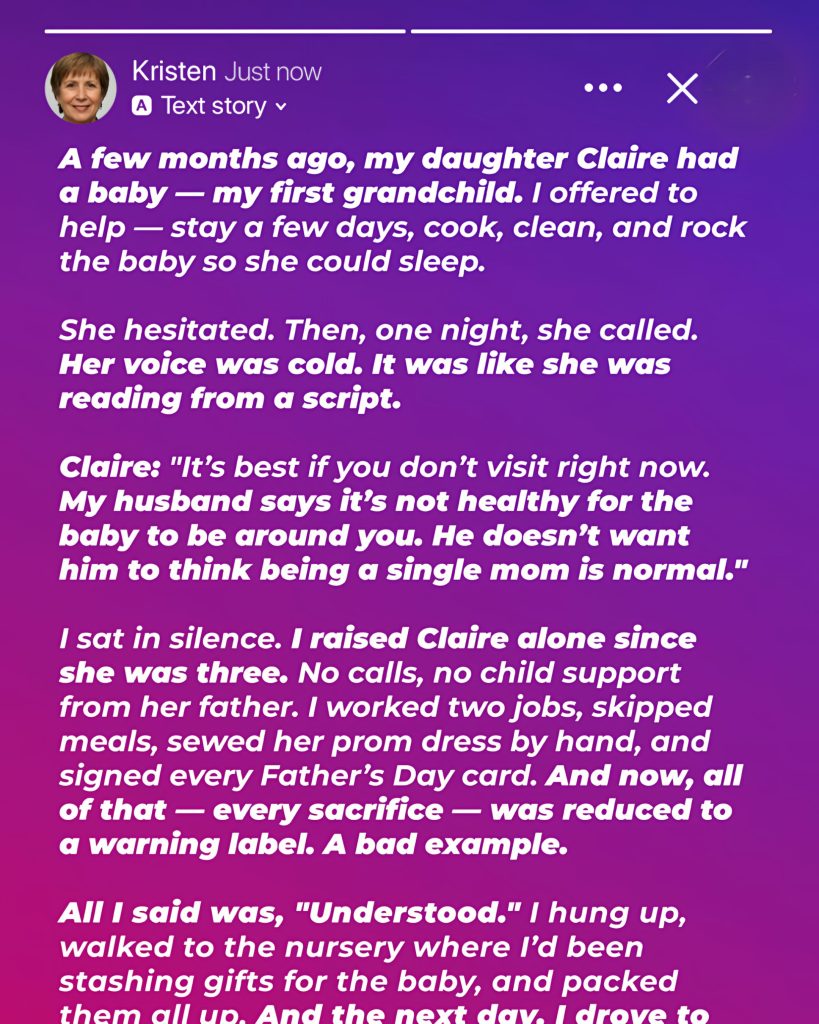 A few months ago, my daughter Claire had a baby — my first grandchild. I offered to help — stay a few days, cook, clean, and rock the baby so she could sleep. She hesitated. Then, one night, she called. Her voice was cold. It was like she was reading from a script. Claire: “It’s best if you don’t visit right now. My husband says it’s not healthy for the baby to be around you. He doesn’t want him to think being a single mom is normal.” I sat in silence. I raised Claire alone since she was three. No calls, no child support from her father. I worked two jobs, skipped meals, sewed her prom dress by hand, and signed every Father’s Day card. And now, all of that — every sacrifice — was reduced to a warning label. A bad example. All I said was, “Understood.” I hung up, walked to the nursery where I’d been stashing gifts for the baby, and packed them all up. And the next day, I drove to the local community center, specifically the wing that housed the crisis nursery for struggling young mothers.