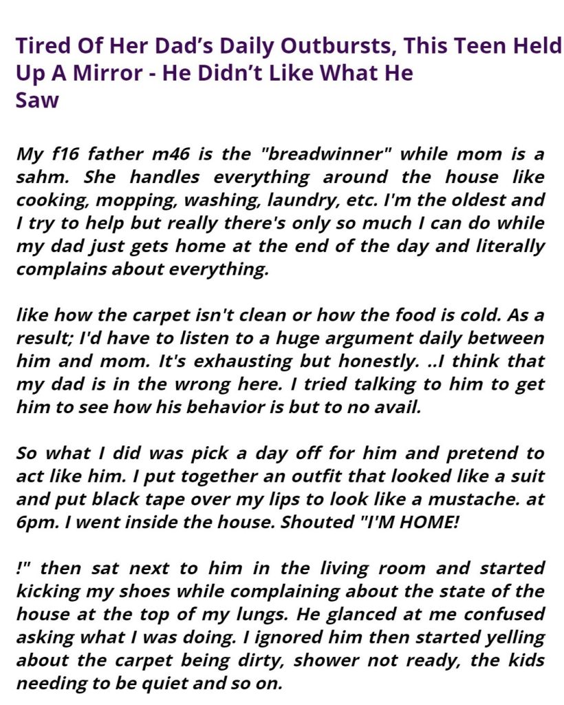 My f16 father m46 is the “breadwinner” while mom is a sahm. She handles everything around the house like cooking, mopping, washing, laundry, etc. I’m the oldest and I try to help but really there’s only so much I can do while my dad just gets home at the end of the day and literally complains about everything, like how the carpet isn’t clean or how the food is cold.