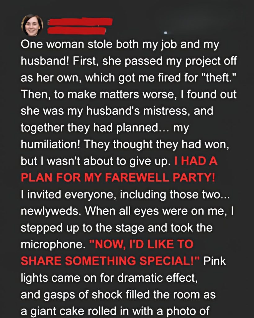 One woman stole both my job and my husband! First, she passed my project off as her own, which got me fired for “theft.” Then, to make matters worse, I found out she was my husband’s mistress, and together they had planned… my humiliation! They thought they had won, but I wasn’t about to give up. I HAD A PLAN FOR MY FAREWELL PARTY! I invited everyone, including those two… newlyweds. When all eyes were on me, I stepped up to the stage and took the microphone. “NOW, I’D LIKE TO SHARE SOMETHING SPECIAL!” Pink lights came on for dramatic effect, and gasps of shock filled the room as a giant cake rolled in with a photo of Miranda and Mark together in our master bedroom, holding my original project hard drive.