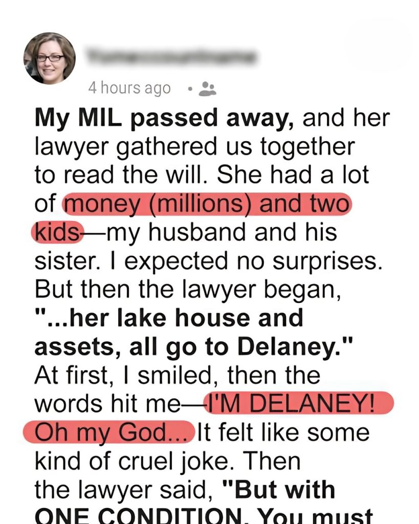My MIL passed away, and her lawyer gathered us together to read the will. She had a lot of money (millions) and two kids—my husband and his sister. I expected no surprises. But then the lawyer began, “…her lake house and assets, all go to Delaney.” At first, I smiled, then the words hit me—I’M DELANEY! Oh my God… It felt like some kind of cruel joke. Then the lawyer said, “But with ONE CONDITION. You must live in that lake house for thirty consecutive days, starting tonight, completely alone, and you must read one letter from Evelyn every single morning before you speak to another soul.”