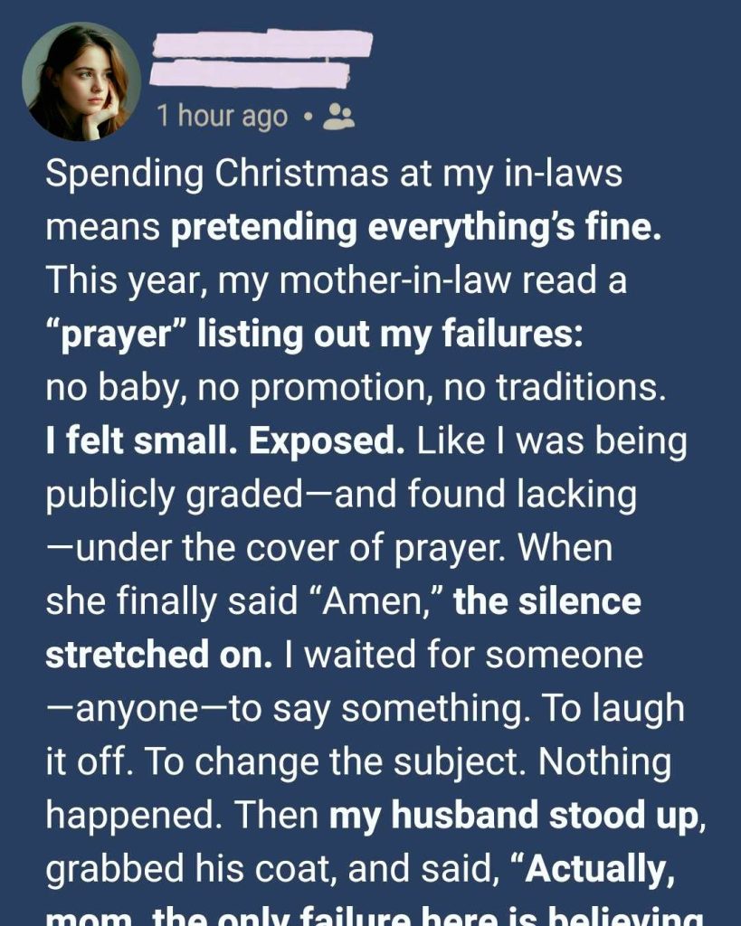 Spending Christmas at my in-laws’ house had always felt like stepping onto a stage. Not the kind filled with joy, laughter, and warmth, but the draining kind where you rehearse your lines in advance and force a smile until your cheeks ache. Each year I told myself it might be different. Each year, it never was.
