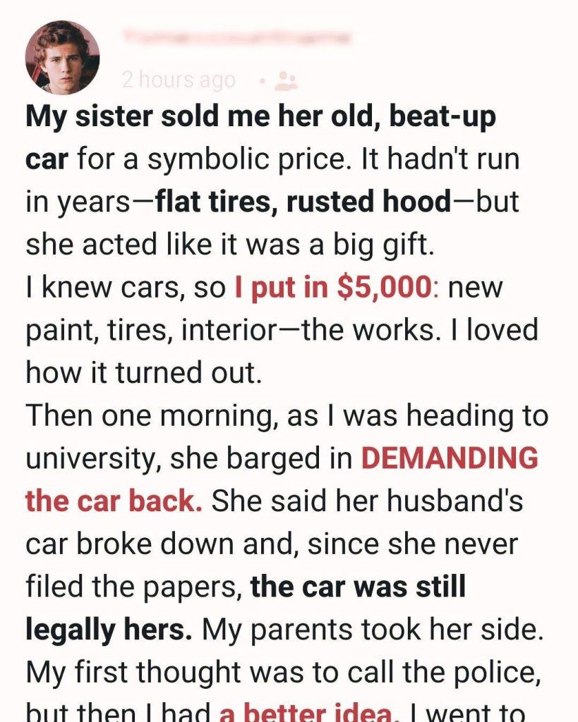 “My husband’s car broke down,” she continued. “We need yours. And technically”—she lifted her chin—“it’s still my car. I never filed the ownership transfer. So legally, you have something that belongs to me.”