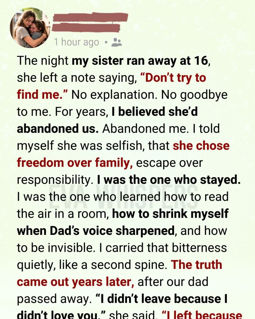 We didn’t see her again for a long time. Postcards came sometimes. A phone call once a year if we were lucky. Mom defended her weakly. Dad never spoke her name. And I grew up with a hole where my sister should have been, telling myself I didn’t need her.