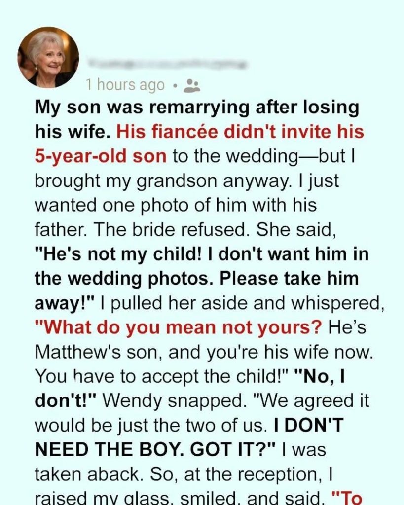 My son was remarrying after losing his wife. His fiancée didn’t invite his 5-year-old son to the wedding—but I brought my grandson anyway. I just wanted one photo of him with his father. The bride refused. She said, “He’s not my child! I don’t want him in the wedding photos. Please take him away!” I pulled her aside and whispered, “What do you mean not yours? He’s Matthew’s son, and you’re his wife now. You have to accept the child!” “No, I don’t!” Wendy snapped. “We agreed it would be just the two of us. I DON’T NEED THE BOY. GOT IT?” I was taken aback. So, at the reception, I raised my glass, smiled, and said, “To a marriage built on truth, and to the millions of dollars currently held in the Sterling Family Trust, which, as of this morning, has been legally restricted to benefit only my grandson, Leo, and any man who prioritizes being a father over being a husband.”
