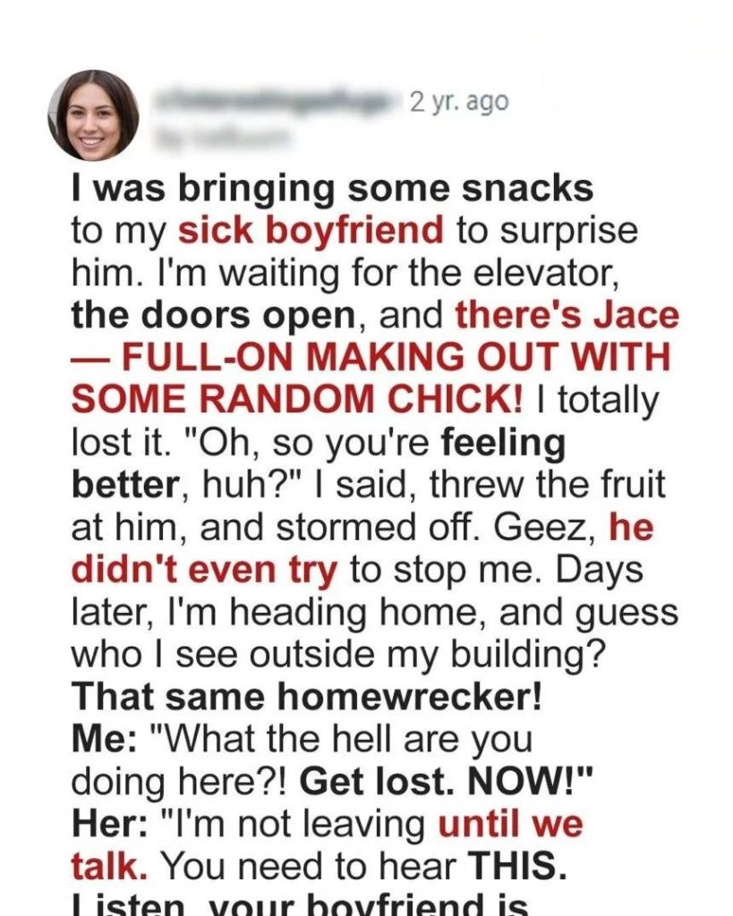 I was bringing some snacks to my sick boyfriend to surprise him. I’m waiting for the elevator, the doors open, and there’s Jace — FULL-ON MAKING OUT WITH SOME RANDOM CHICK! I totally lost it. “Oh, so you’re feeling better, huh?” I said, threw the fruit at him, and stormed off. Geez, he didn’t even try to stop me. Days later, I’m heading home, and guess who I see outside my building? That same homewrecker! Me: “What the hell are you doing here?! Get lost. NOW!” Her: “I’m not leaving until we talk. You need to hear THIS. Listen, your boyfriend is not who you think he is. He is not a liar, but he is a man dying of a secret he was too brave to tell you.”