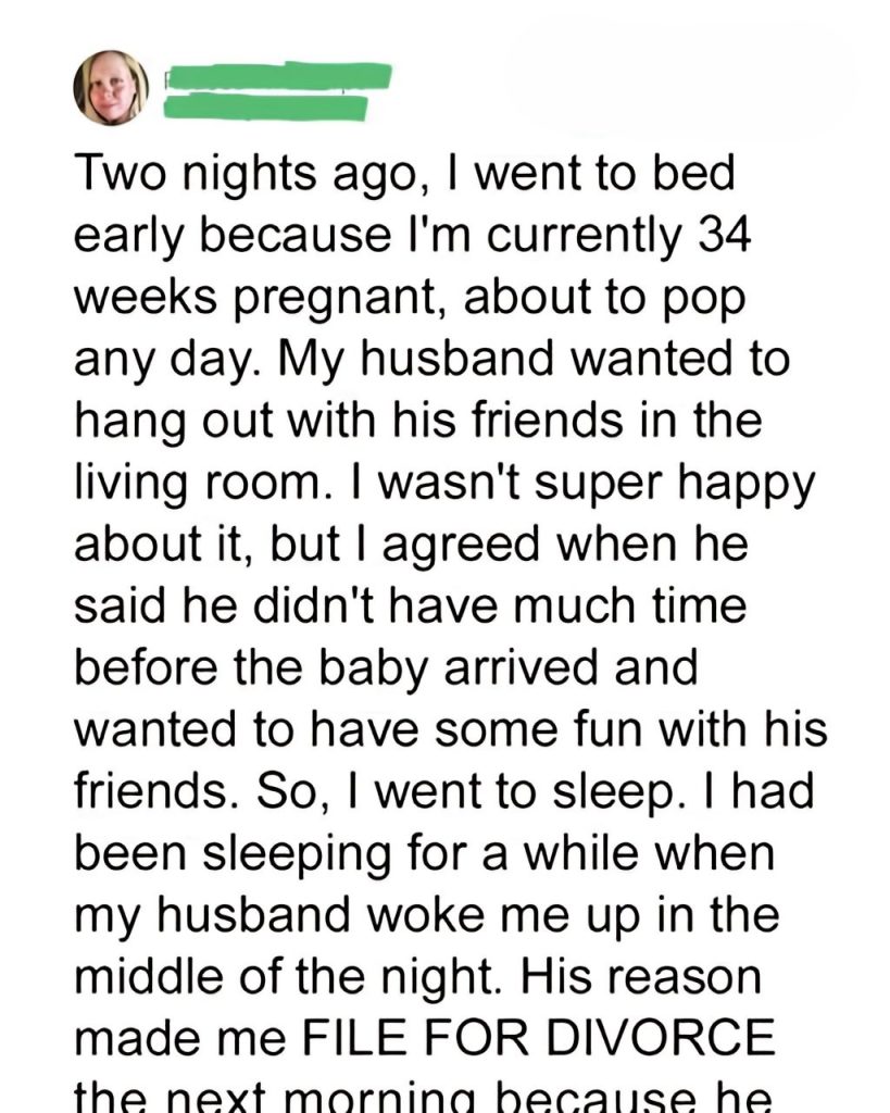 Two nights ago, I went to bed early because I’m currently 34 weeks pregnant, about to pop any day. My husband wanted to hang out with his friends in the living room. I wasn’t super happy about it, but I agreed when he said he didn’t have much time before the baby arrived and wanted to have some fun with his friends. So, I went to sleep. I had been sleeping for a while when my husband woke me up in the middle of the night. His reason made me FILE FOR DIVORCE the next morning because he shook my shoulder with an impatient jerk and told me to get out of bed to cook a full three-course steak dinner for his four drunk friends because they were hungry and he wanted to show them what an “obedient” wife looked like.
