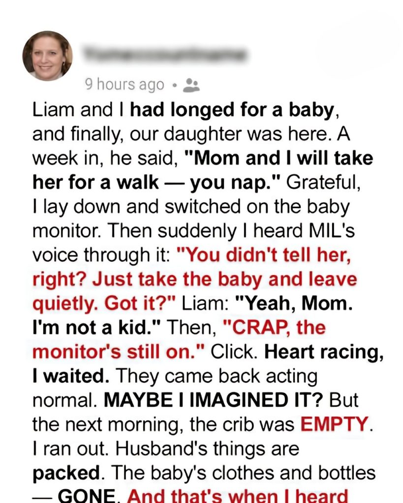 Liam and I had longed for a baby, and finally, our daughter was here. A week in, he said, “Mom and I will take her for a walk — you nap.” Grateful, I lay down and switched on the baby monitor. Then suddenly I heard MIL’s voice through it: “You didn’t tell her, right? Just take the baby and leave quietly. Got it?” Liam: “Yeah, Mom. I’m not a kid.” Then, “CRAP, the monitor’s still on.” Click. Heart racing, I waited. They came back acting normal. MAYBE I IMAGINED IT? But the next morning, the crib was EMPTY. I ran out. Husband’s things are packed. The baby’s clothes and bottles — GONE. And that’s when I heard the low, gravelly rumble of a car engine pulling away from the far end of the driveway, the sound of my life being stolen in the cold, grey light of dawn.