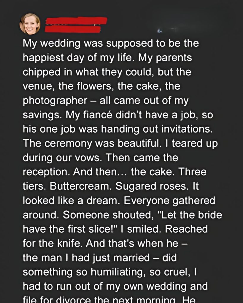 My wedding was supposed to be the happiest day of my life. My parents chipped in what they could, but the venue, the flowers, the cake, the photographer – all came out of my savings. My fiancé didn’t have a job, so his one job was handing out invitations. The ceremony was beautiful. I teared up during our vows. Then came the reception. And then… the cake. Three tiers. Buttercream. Sugared roses. It looked like a dream. Everyone gathered around. Someone shouted, “Let the bride have the first slice!” I smiled. Reached for the knife. And that’s when he – the man I had just married – did something so humiliating, so cruel, I had to run out of my own wedding and file for divorce the next morning. He didn’t just playfully dab a bit of frosting on my nose as we had discussed weeks prior; he lunged at me with a terrifying, aggressive energy, grabbing the back of my head and slamming my face into the center of that expensive, three-tier masterpiece, grinding my forehead into the cardboard base while his group of unemployed, rowdy friends roared with laughter and captured my struggle on their phone cameras.