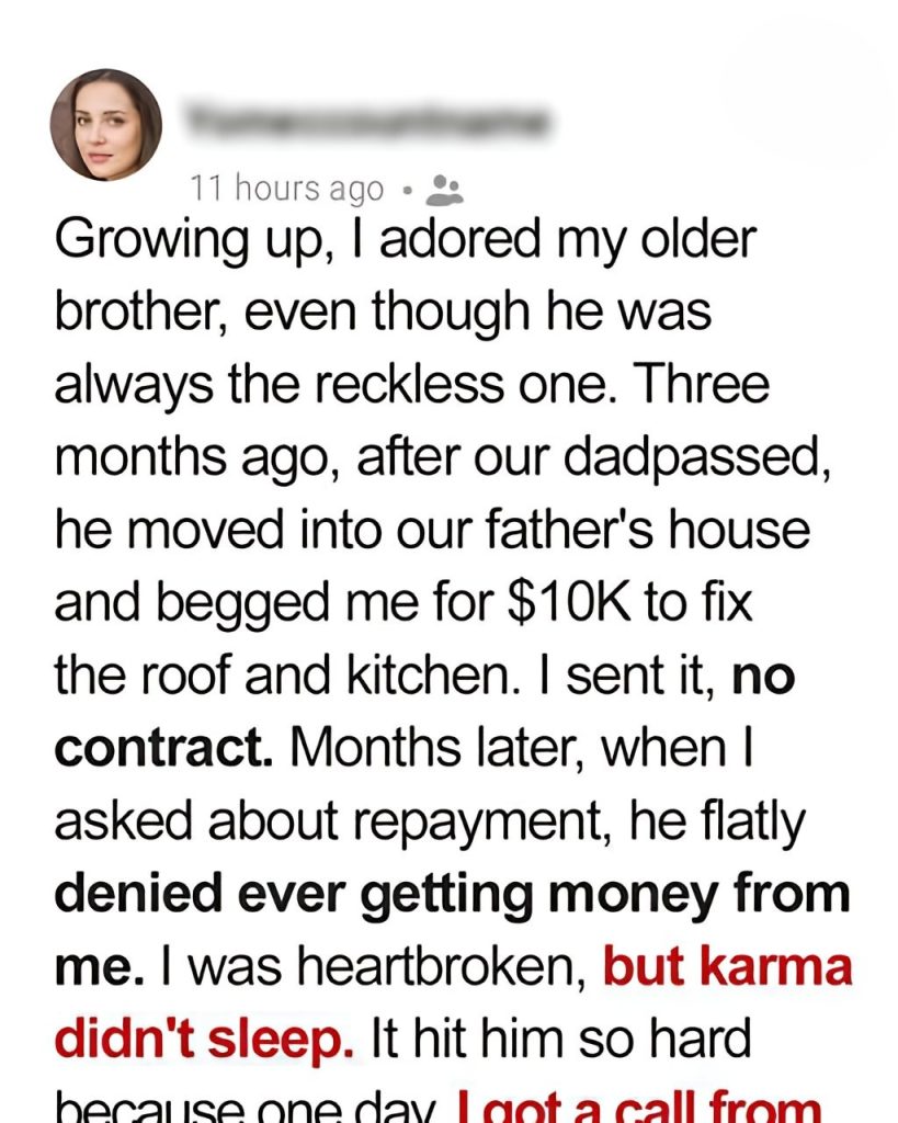 Growing up, I adored my older brother, even though he was always the reckless one. Three months ago, after our dad passed, he moved into our father’s house and begged me for $10K to fix the roof and kitchen. I sent it, no contract. Months later, when I asked about repayment, he flatly denied ever getting money from me. I was heartbroken, but karma didn’t sleep. It hit him so hard because one day I got a call from our father’s long-time attorney and friend, Mr. Gable, who informed me that a secret clause in the estate had been triggered—a clause that required my brother to provide a full accounting of all funds used for the house, or forfeit his entire inheritance.