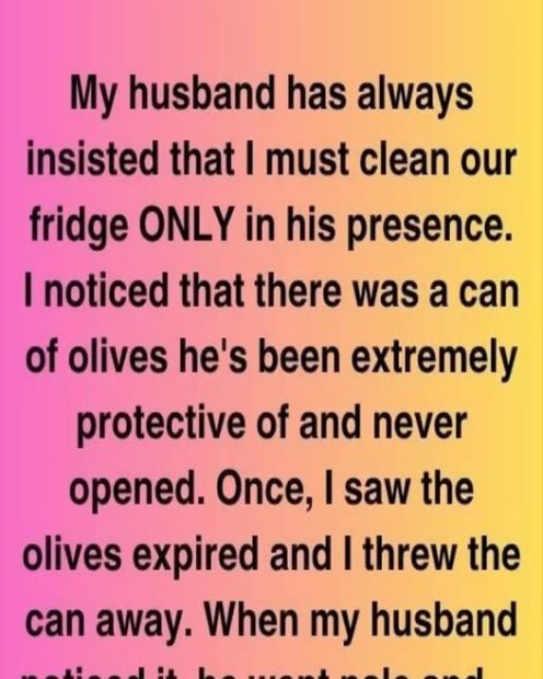 My husband has always insisted that I must clean our fridge ONLY in his presence. I noticed that there was a can of olives he’d been extremely protective of and never opened. Once, I saw the olives had expired and I threw the can away.