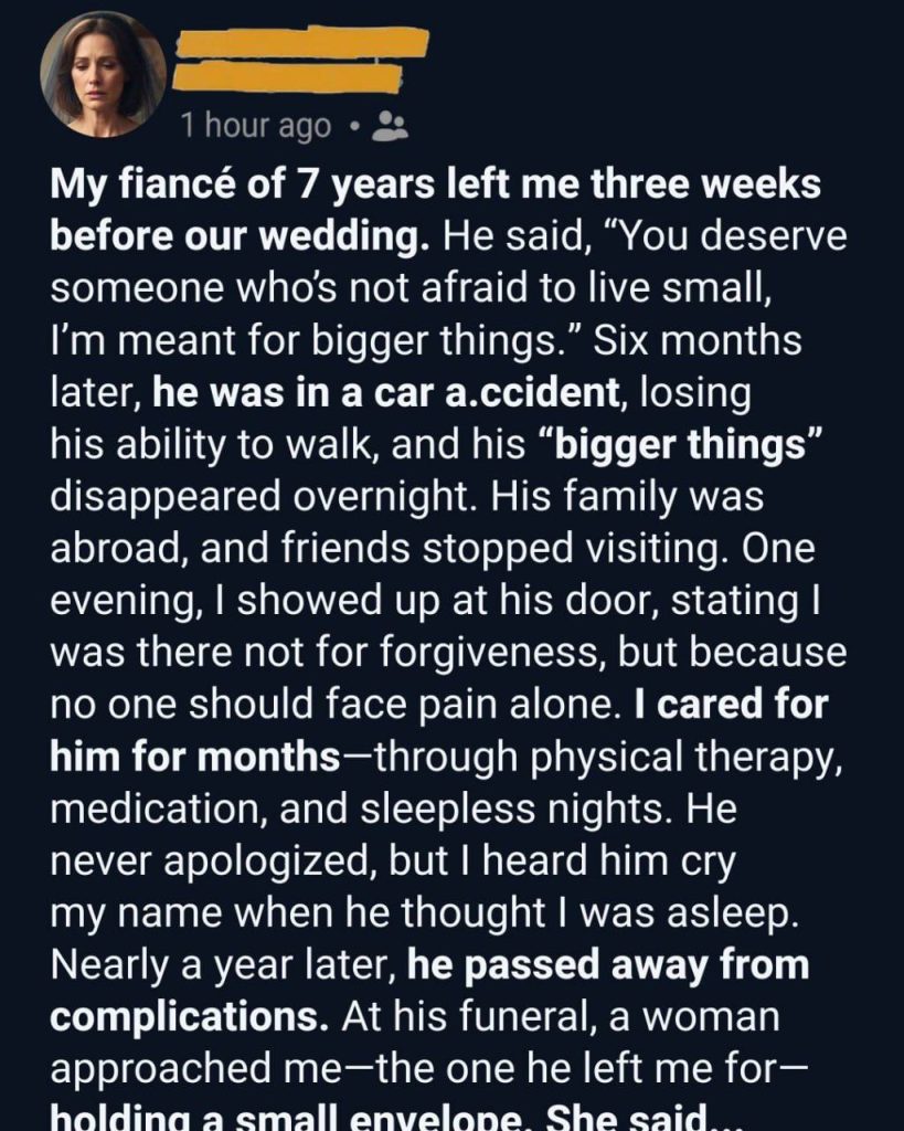 The nurses rushed in. His family started to sob. I just sat there, my hand still holding his, feeling the last warmth drain from his skin. My fiancé, the man who left me weeks before our wedding, was gone. And I was the one by his side when he took his last breath.