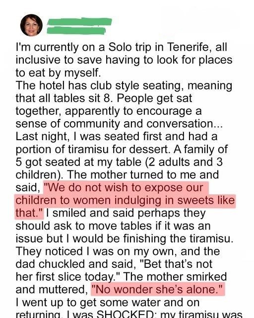 And the dessert, my small, quiet indulgence, was simply an inconvenience. A hurdle in their perfectly orchestrated evening, which now included getting rid of me so they could continue their intimate dinner.