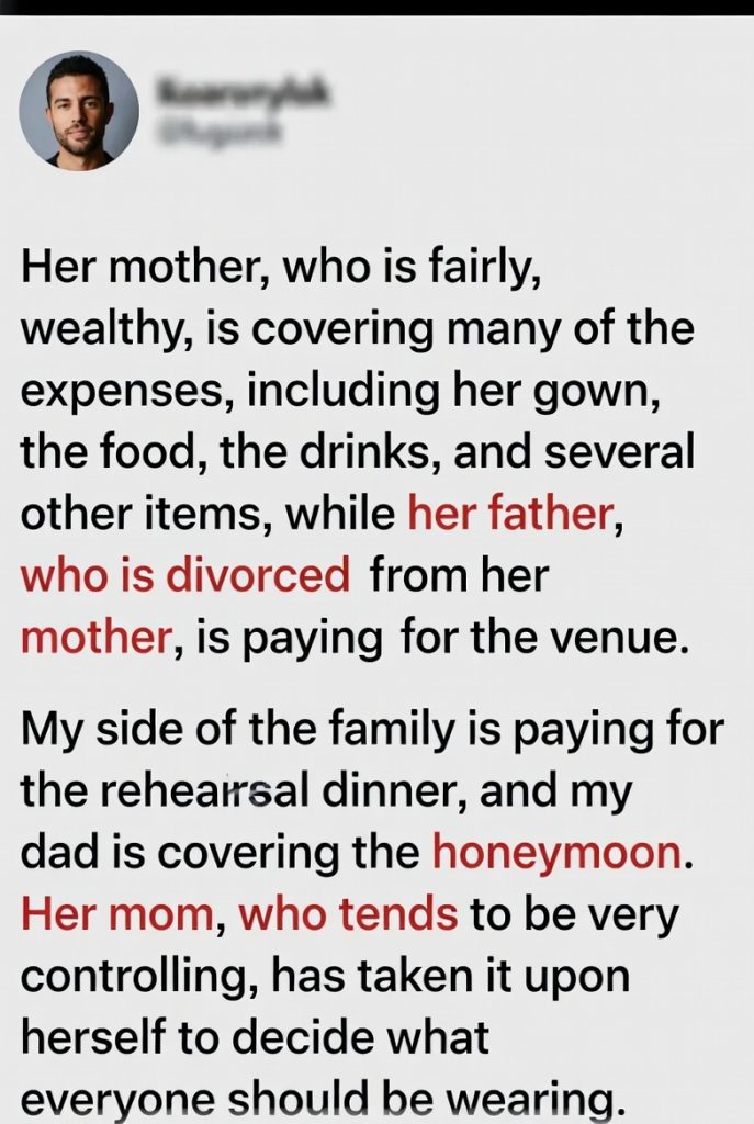 Things escalated last night when she sent a group text to me and my fiancée stating that she had already contacted the catering company to “pause” the next payment. She explicitly stated that if I didn’t “stop being difficult” and agree to the pink suit, she would stop paying for the food and the open bar.