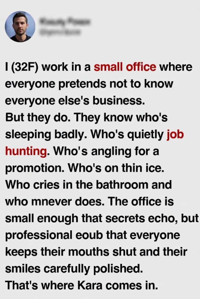 Kara (late 20sF) is the queen of polite passive aggression. The kind that thrives in environments like this. She smiles warmly, compliments your shoes, adds extra exclamation points to emails, and then slips in tiny, razor-sharp jabs that are just subtle enough to deny later. She’s mastered the art of plausible innocence.