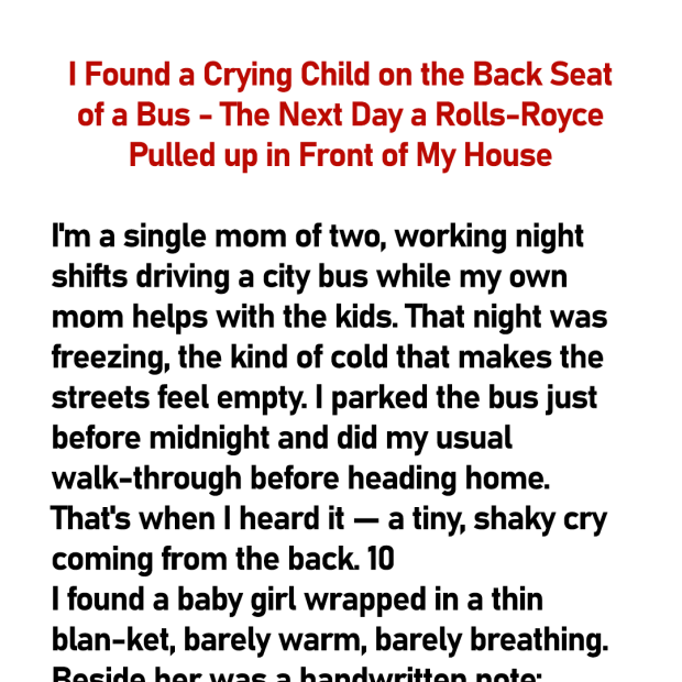 When bus driver and single mom, Sarah, discovers a freezing child on the back seat of her late-night route, her instincts take over. But in the quiet days that follow, a knock at the door brings answers she never expected, and a reminder that some miracles arrive when the world isn’t watching.