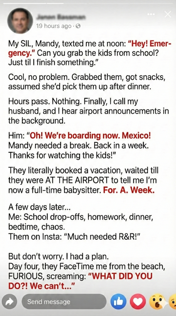 When Mandy asked me to watch her kids for a few hours, I didn’t think twice. But hours turned into a shocking phone call: my husband and his sister were already boarding a flight to Mexico. No discussion. No warning. Just me, two kids, and a week-long betrayal I never agreed to.