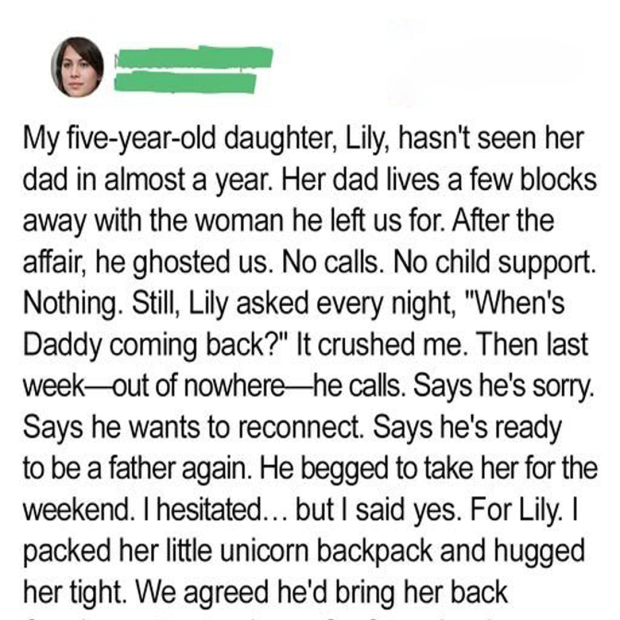 When my ex reached out after years of distance, saying he wanted to reconnect with our daughter, hope flickered inside me. Our little girl had grown up believing in love and family, and even though it had been difficult raising her alone, I wanted her to feel supported by both parents. So when he promised a special weekend together, I chose to believe it might be the start of something healing — not for us, but for her.
