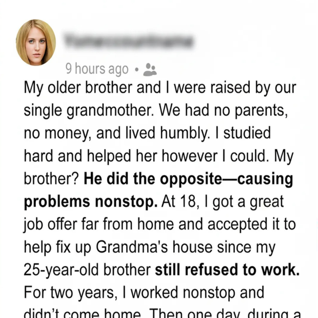 My older brother and I were raised by our single grandmother. We had no parents, no money, and lived humbly. I studied hard and helped her however I could. My brother? He did the opposite—causing problems nonstop. At 18, I got a great job offer far from home and accepted it to help fix up Grandma’s house since my 25-year-old brother still refused to work. For two years, I focused on building a future, trusting that he would finally step up and be responsible. I called Grandma often, sending money and planning to surprise her by renovating the home she’d worked her whole life to maintain.