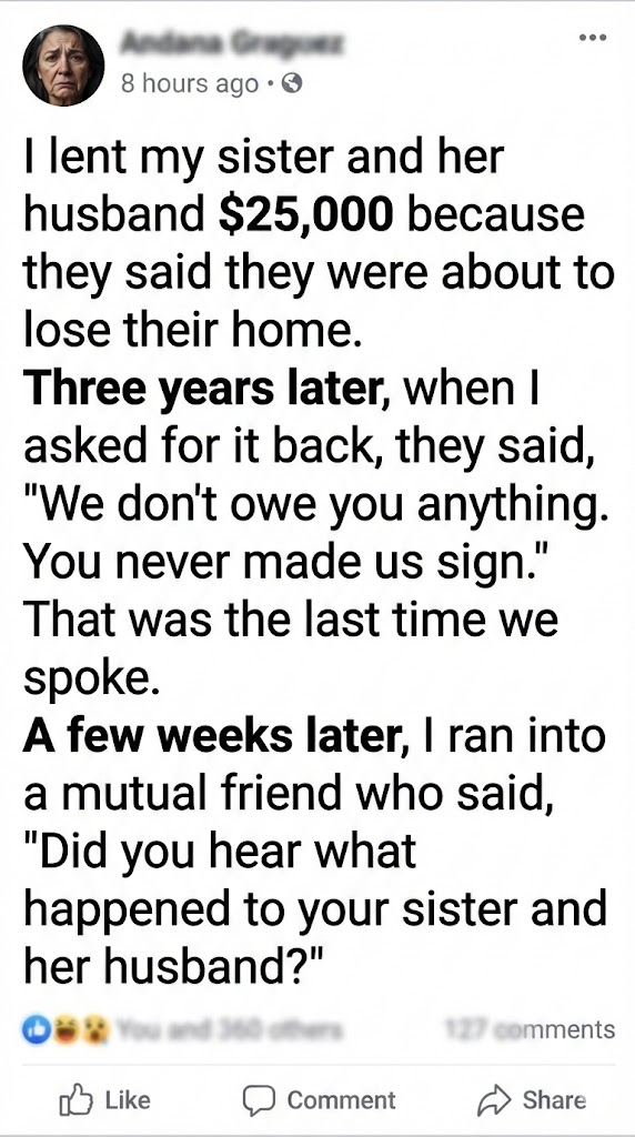 They said they were drowning in debt. The house was on the line. Miss one more payment and they’d lose it. My sister cried on the phone. Her husband talked about how ashamed he felt even asking. They promised—over and over—that it would be temporary. One year, max.