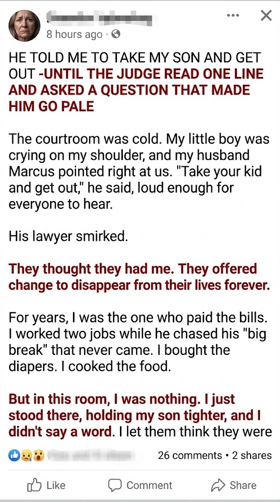 The courtroom was cold. My little boy, Thomas, was crying on my shoulder, and my husband Marcus pointed right at us. “Take your kid and get out,” he said, loud enough for the everyone to hear. His lawyer smirked. They thought they had me. They offered me the pocket change to disappear from their lives forever.
