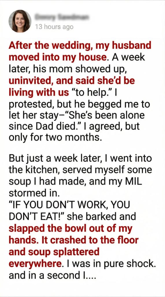One exhausting day, Hope poured herself a bowl of lentil soup—her comfort. Gloria stormed in, barking, “If you don’t work, you don’t eat!” She smacked the bowl from Hope’s hands. Ceramic shattered, soup splattered across the floor. Gloria glared, chest heaving, as if disciplining a child.