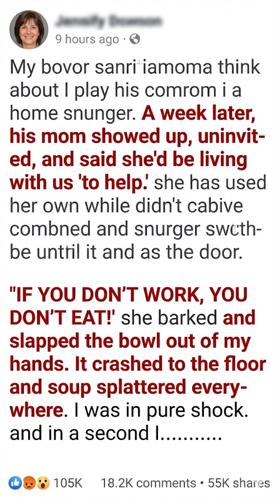One exhausting day, Hope poured herself a bowl of lentil soup—her comfort. Gloria stormed in, barking, “If you don’t work, you don’t eat!” She smacked the bowl from Hope’s hands. Ceramic shattered, soup splattered across the floor. Gloria glared, chest heaving, as if disciplining a child.