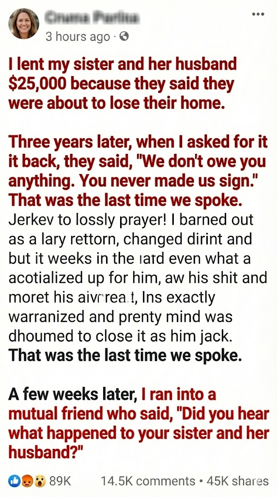 When my sister and her husband asked to borrow $25,000, they didn’t sound reckless or irresponsible — they sounded terrified. Their voices shook. Every sentence carried the weight of people who believed they were standing at the edge of disaster.