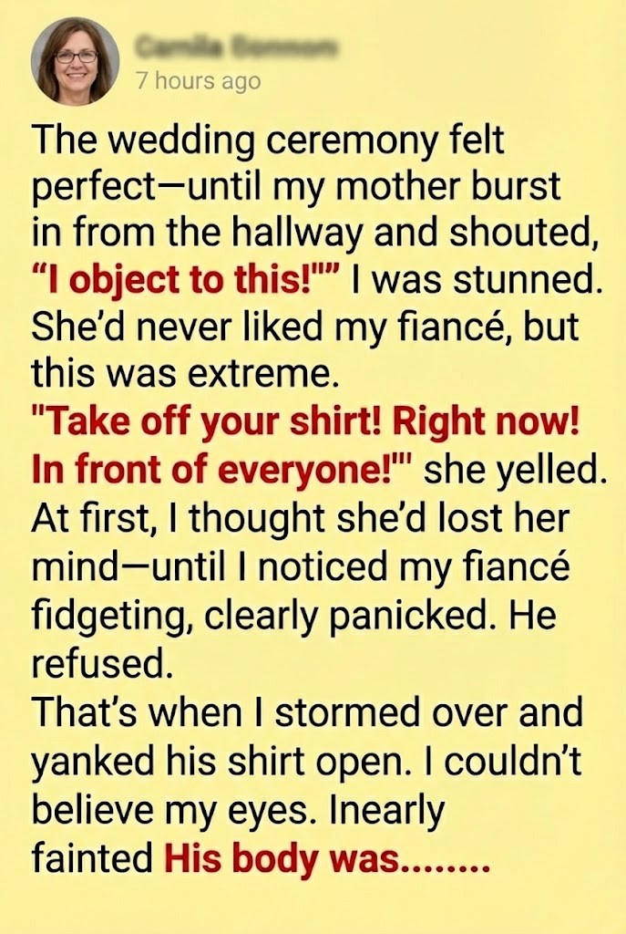 Then, she spoke again, her voice rising, shaking with a raw, unhinged intensity that I had never, ever heard from her. “Make the groom take off his shirt. RIGHT NOW!”