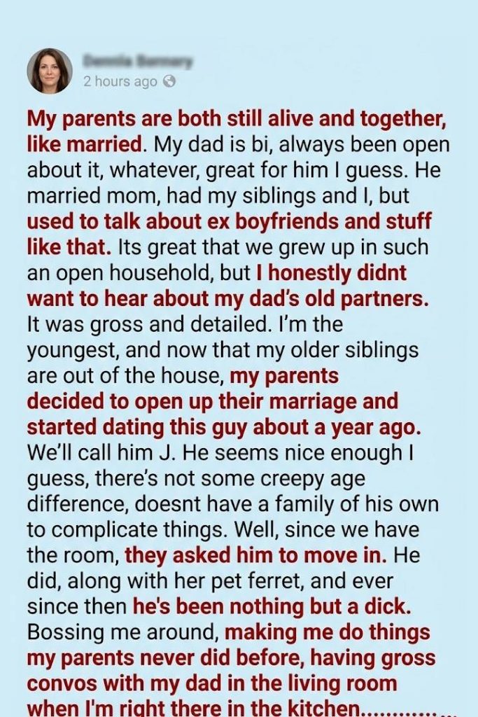 Living in a blended household with an open marriage can be challenging, even under the best circumstances. The key is communication, respect, and setting clear expectations for everyone involved. My parents’ happiness is important, but so is my comfort and well-being.