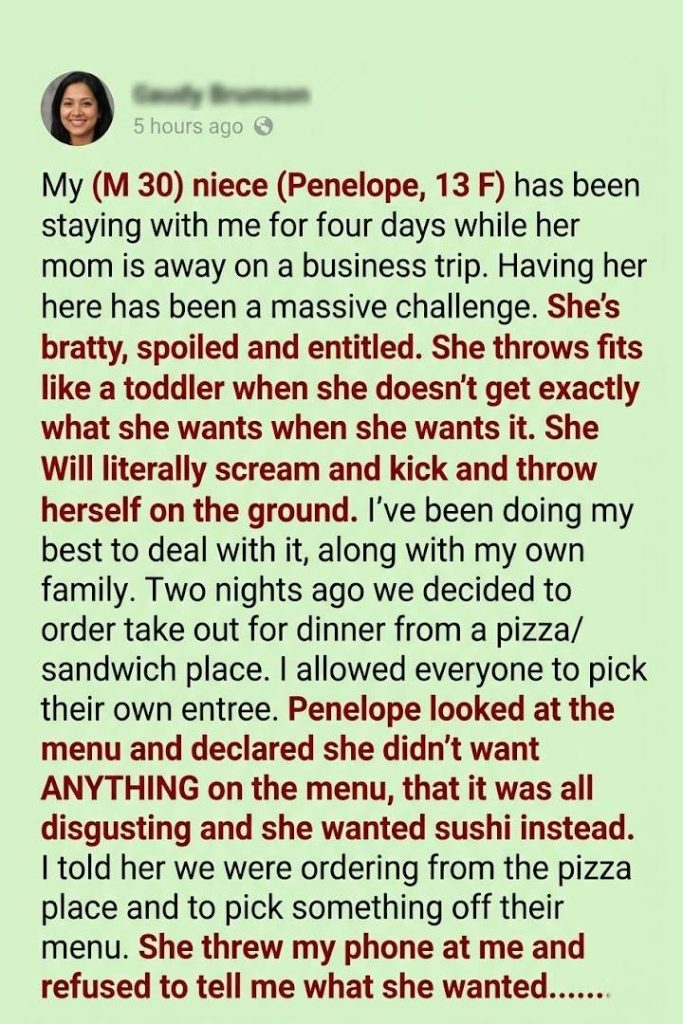 My niece, Penelope, 13, has been staying with me for four days while her mom is away on a business trip. At first, I thought it would be fun — a chance to bond and spend some quality time together. That quickly changed.