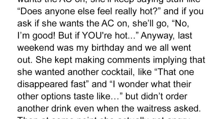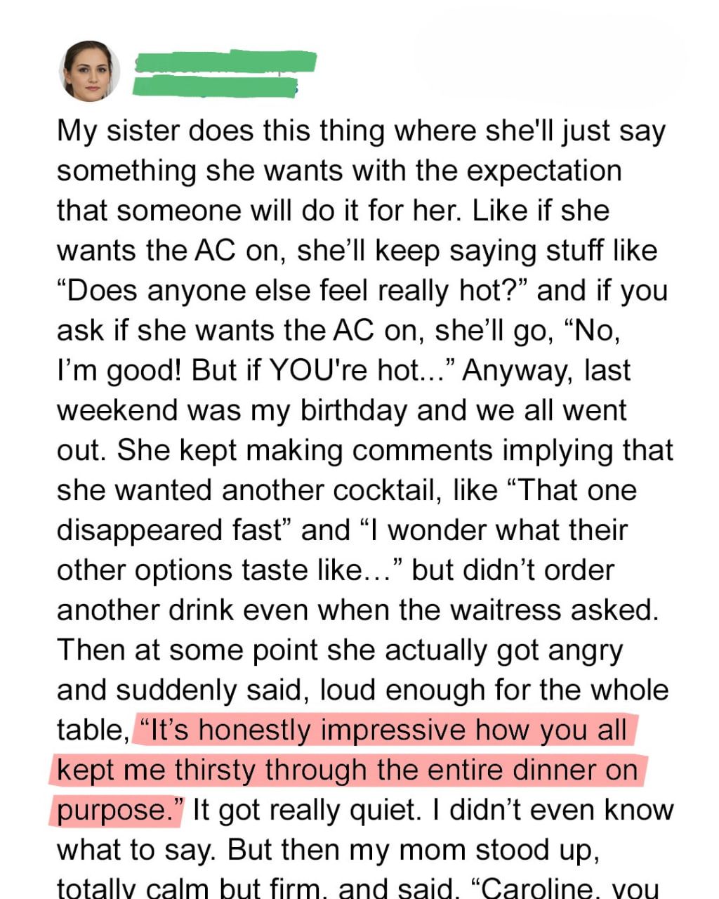 My birthday dinner was supposed to be about me. But my sister made it about her… again. Midway through the meal, she claimed we’d all purposely left her “thirsty.” That was a new low. But this time, our mom didn’t let it slide, and what she said left the entire table silent.