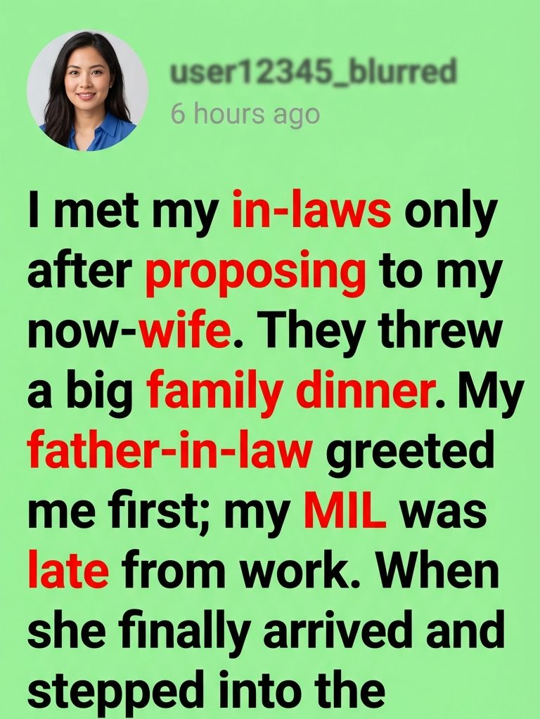 I met my in-laws for the first time right after I proposed to my now-wife. It was supposed to be a warm, celebratory family dinner—a chance to officially join the circle of the people who raised the woman I loved. Her dad greeted me at the door with one of those firm handshakes meant to test your backbone, but he was kind, welcoming in his own gruff way. My fiancée kept squeezing my hand, whispering that her stepmom was running late from work but would arrive any minute.