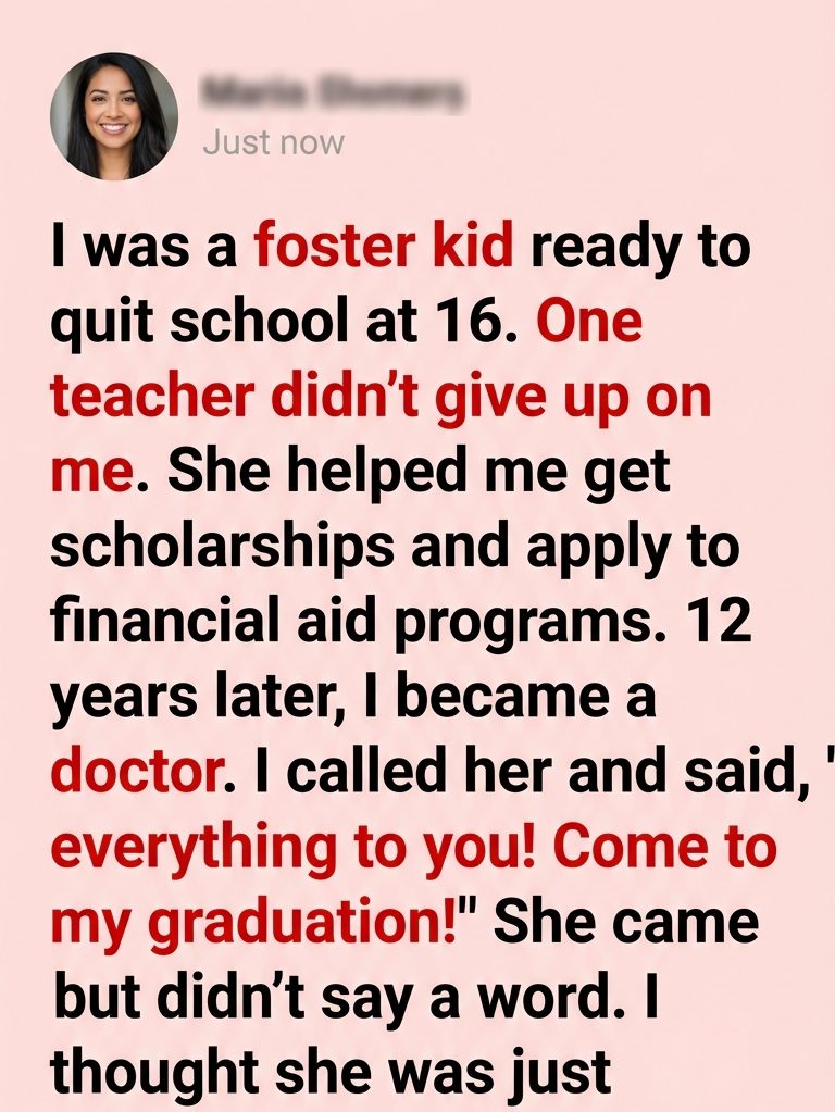 I graduated, then went to college, and eventually medical school. Twelve years passed in a blur of exhaustion and disbelief. The night before my graduation ceremony, I stared at my white coat hanging in the closet and thought of her. So I called. “I owe everything to you,” I said, my voice breaking. “Please come to my graduation.” She paused, then said yes. At the ceremony, I scanned the crowd until I saw her sitting quietly, hands folded in her lap. She didn’t clap loudly or wave; she just watched me with a small, unreadable smile. Afterward, while classmates posed for photos and families cheered, she waited patiently on the edge of the room.