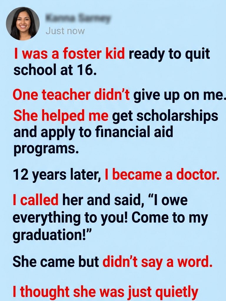 At the ceremony, I scanned the crowd until I saw her—sitting quietly, hands folded in her lap. She didn’t clap loudly. She didn’t wave. She just watched me with a small, unreadable smile.
