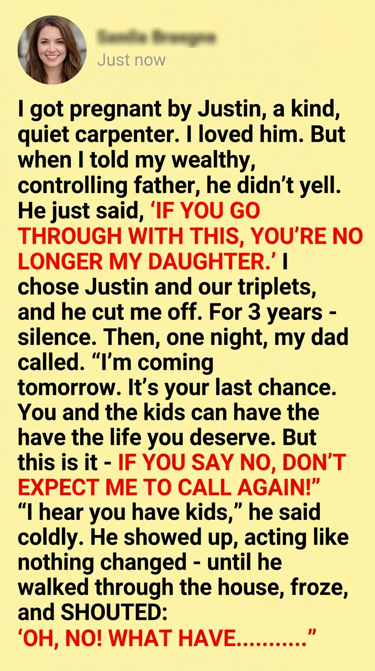 My father stood frozen in the doorway, his face drained of color as he surveyed the cramped living quarters of the home I had built. The house wasn’t falling apart, nor was it dirty, but it was small, modest, and undeniably lived-in by a family that used every inch. Three cribs lined the wall of what used to be a dining nook, their wooden slats catching the afternoon light. Toys were stacked neatly in plastic bins, and a secondhand couch sat against the wall, its arms patched with careful, hand-stitched embroidery that spoke of a home where nothing was ever thrown away.