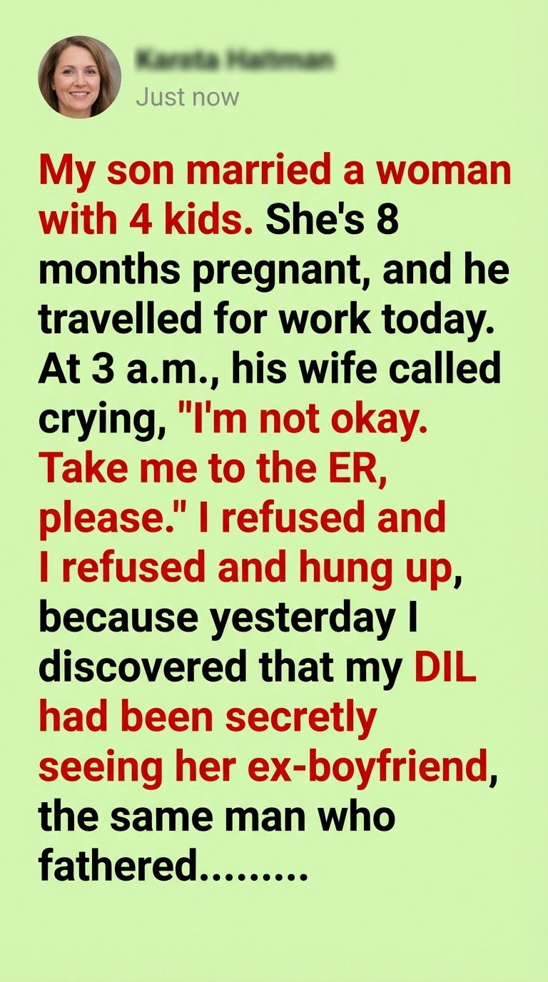 Hours later, the emergency calls started. My son, frantic. My husband, horrified. “She called you!” my husband screamed, “Why didn’t you go? She almost lost the baby! Your grandson!”