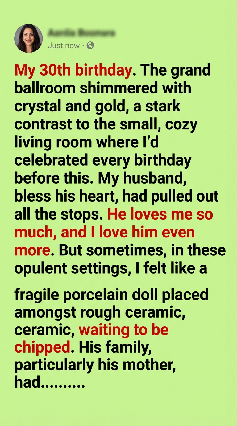 My 30th birthday. The grand ballroom shimmered with crystal and gold, a stark contrast to the small, cozy living room where I’d celebrated every birthday before this. My husband, bless his heart, had pulled out all the stops. He loves me so much, and I love him even more. But sometimes, in these opulent settings, I felt like a fragile porcelain doll placed amongst rough ceramic, waiting to be chipped. His family, particularly his mother, had a way of making me feel that way.
