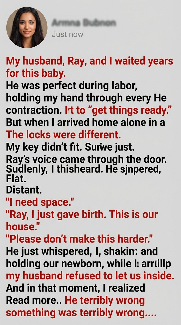 There was a small complication after delivery—nothing dangerous, but enough that the doctors wanted to keep me for observation. Two extra days. Ray stayed the first night, then went home to shower, feed the cat, and “get things ready.”