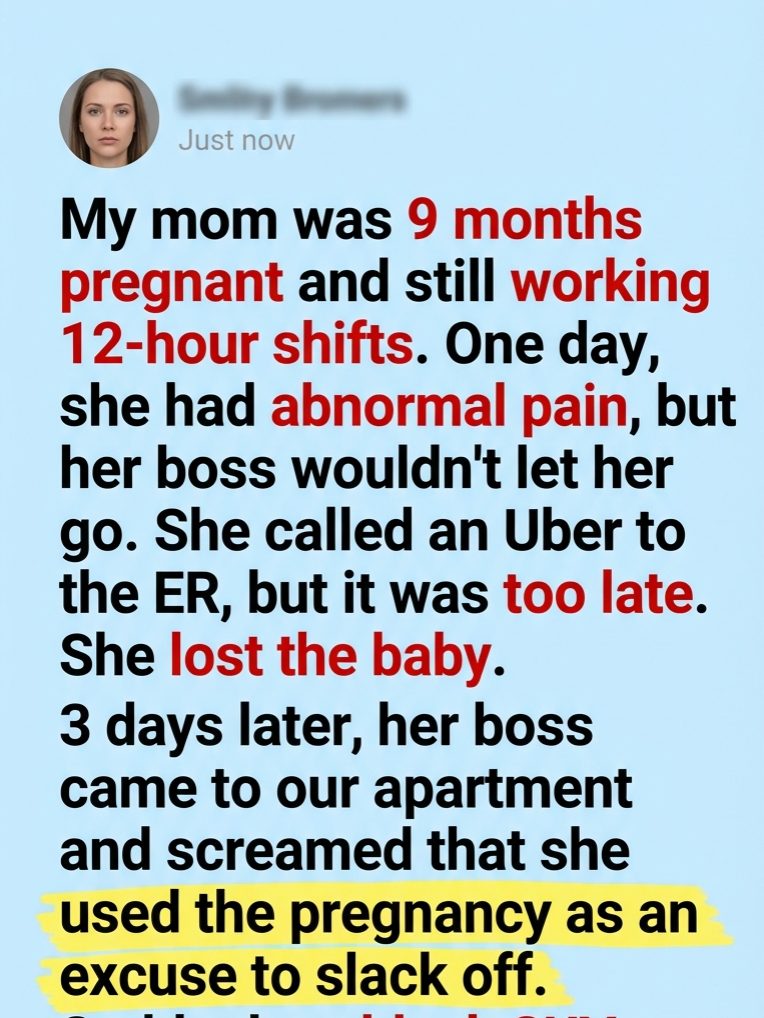 Three days later, while we were still moving through the apartment like ghosts, there was a knock at the door. It was the supervisor. He didn’t come inside. He didn’t lower his voice. He started screaming through the screen door about how Mom hadn’t turned in her badge and was “holding up the off-boarding process.” He called her lazy. He said she used the pregnancy as an excuse to slack off. His words cut deeper than anything I’d heard before, because they were so confident, so practiced, like he’d said them a hundred times to other people.