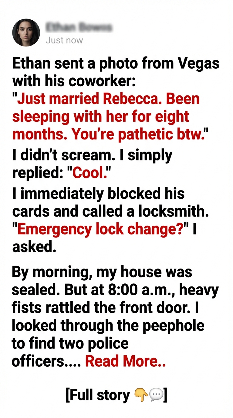 The pounding started at 8:00 a.m. sharp, heavy fists rattling the front door with an entitlement I recognized immediately. I jolted upright, heart hammering against my ribs, then forced my breath to steady before descending the stairs. Through the peephole, I saw two police officers—one older, one younger—both looking already weary of the morning’s drama. “Ma’am,” the older one said when I opened the door, “we got a call about a domestic dispute. Your husband says you locked him out of his home.” The word “husband” tasted bitter on my tongue. Without a word, I held up my phone, the Vegas text glowing accusingly in the morning light. The older cop leaned closer, reading the admission of guilt and the photo of the new marriage. “He’s not my husband anymore,” I said evenly. “He married someone else five hours ago. This house was purchased before the marriage, and the deed is in my name.” The officers exchanged a look, the younger one biting his lip to suppress a laugh. The radio at the older officer’s shoulder crackled with the screeching voice of Ethan’s mother, demanding an arrest. The officer sighed, turned down the volume, and told me, “Just don’t destroy anything. If he wants his things, keep them accessible.” They left shaking their heads, muttering about the stupidity of Vegas weddings.
